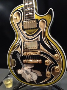 Some of the stand-outs included a speaker cabinet he obviously made by hand in a barn or something in the late 40s / early 50s, an absolutely gorgeously painted gold Les Paul that had a timeline of his life events encircling the sides and his face on the front, the ‘30s Gibson L-4 archtop that had been owned by Eddie Lang, a really bizarre “no name†Jazzmaster style guitar with a whole bunch of weird push button switches on it and a lapel mic on a long metal tube coming out of the top horn above the fingerboard (Les did that to lots of his guitars with XLR jacks by the strap buttons and I saw pictures of both he and Mary Ford on stage in the 50s singing through them), lots of amazing awards (I wanted one from the Django Reinhardt Society to him since my dog is named Django as well), huge recoding consoles and racks of effects from the 50s up to digital stuff from now, and a silver wrist watch inscribed “To Les Paul From Frank Sinatra†– and lots of “Frankenstein-ed†vintage guitars that he took a saw to and put other pick ups, switches etc. inside of – inventor types don’t think a lot about keeping things true to the past to preserve value, they just want to build for the future now.